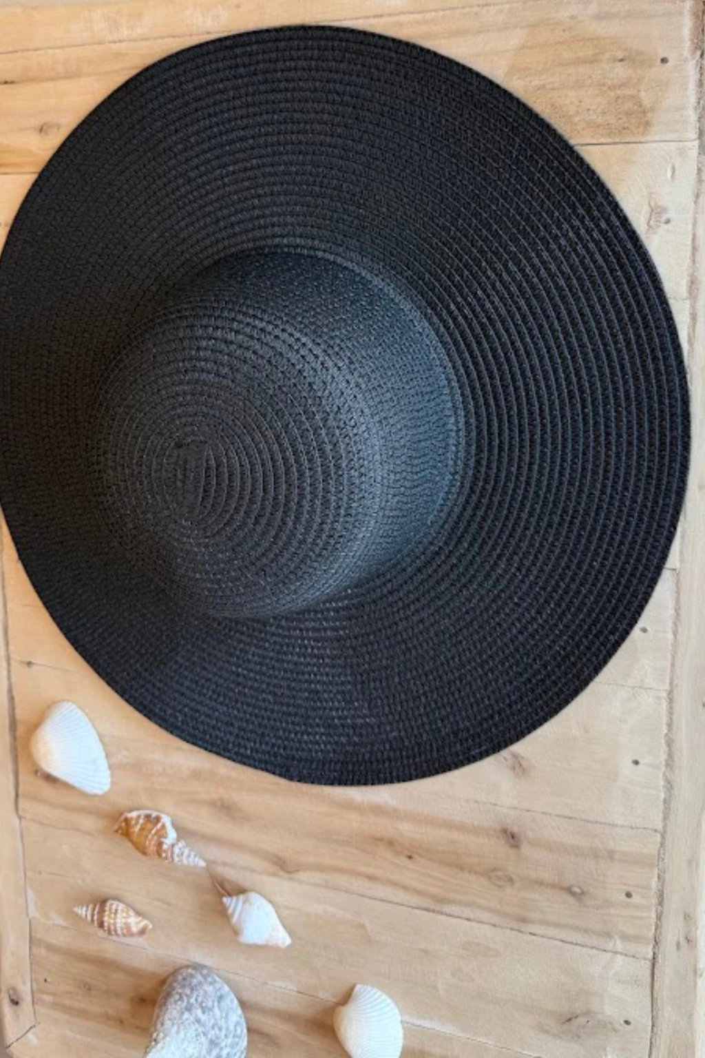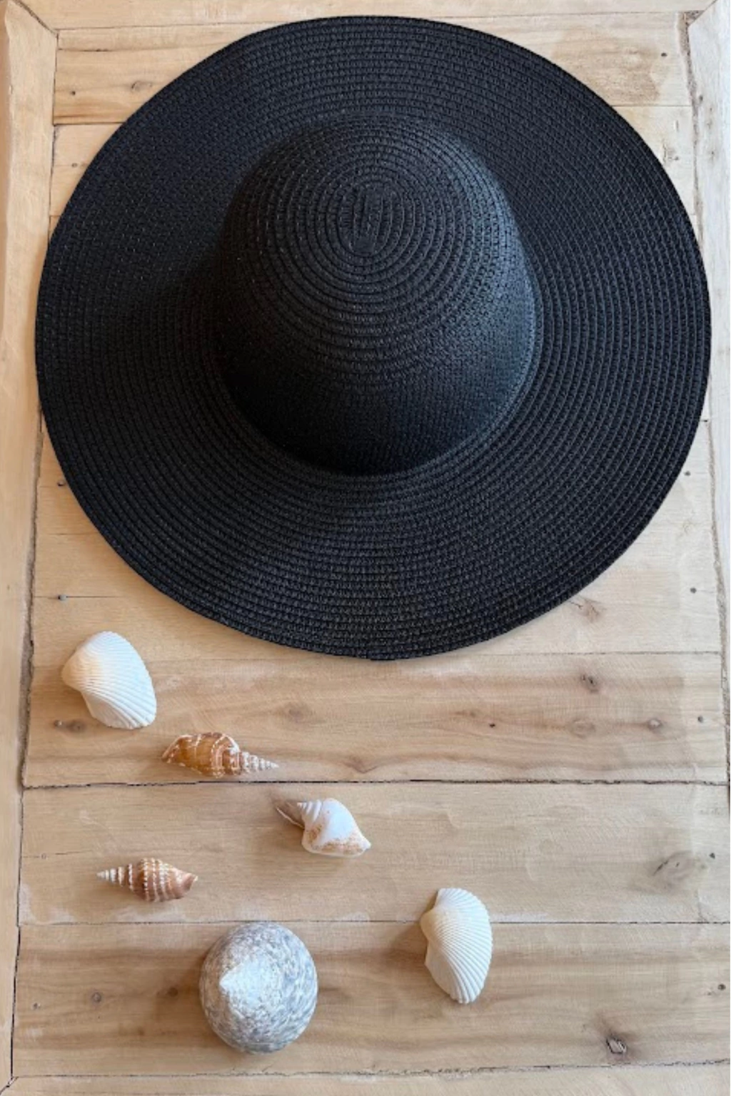 Un sombrero simil rafia con ala ancha iseal para prtegerse del sol. Color Negro.